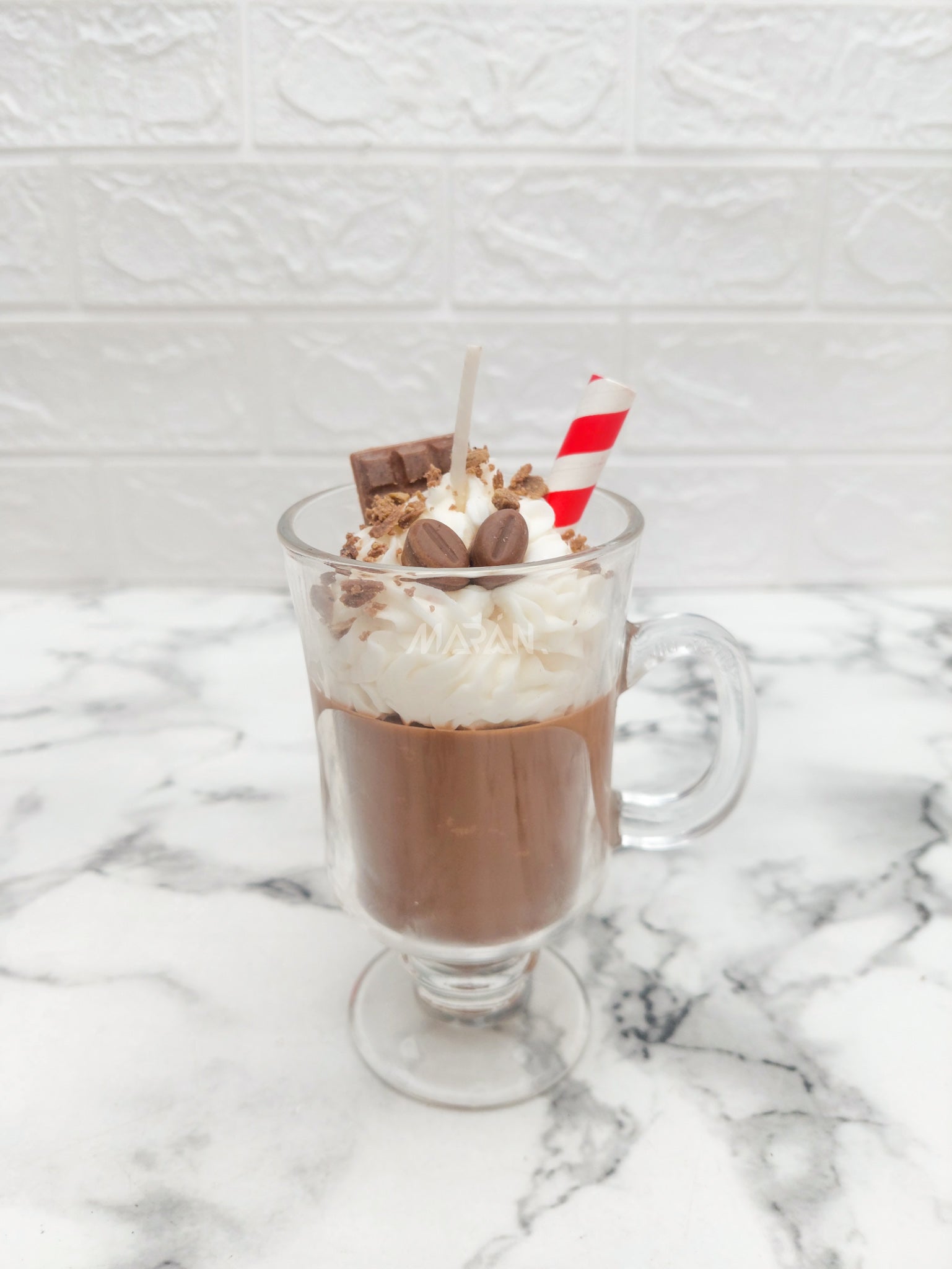 Vela Capuchino Café Grande contiene 215 g aprox. de cera de soya 100% natural, hecho completamente a mano. Su diseño imita el aspecto cremoso de un capuchino real, ideal para decorar cocinas, livings, habitaciones o rincones acogedores.